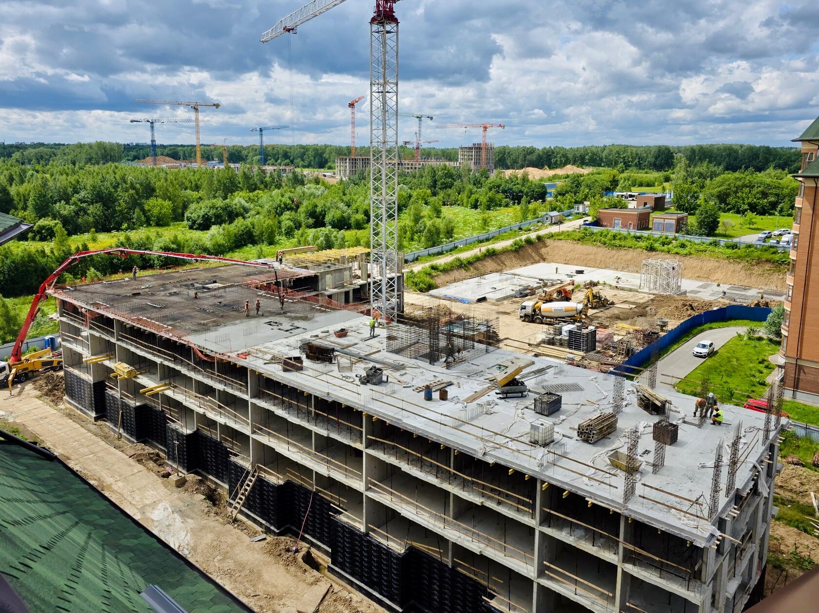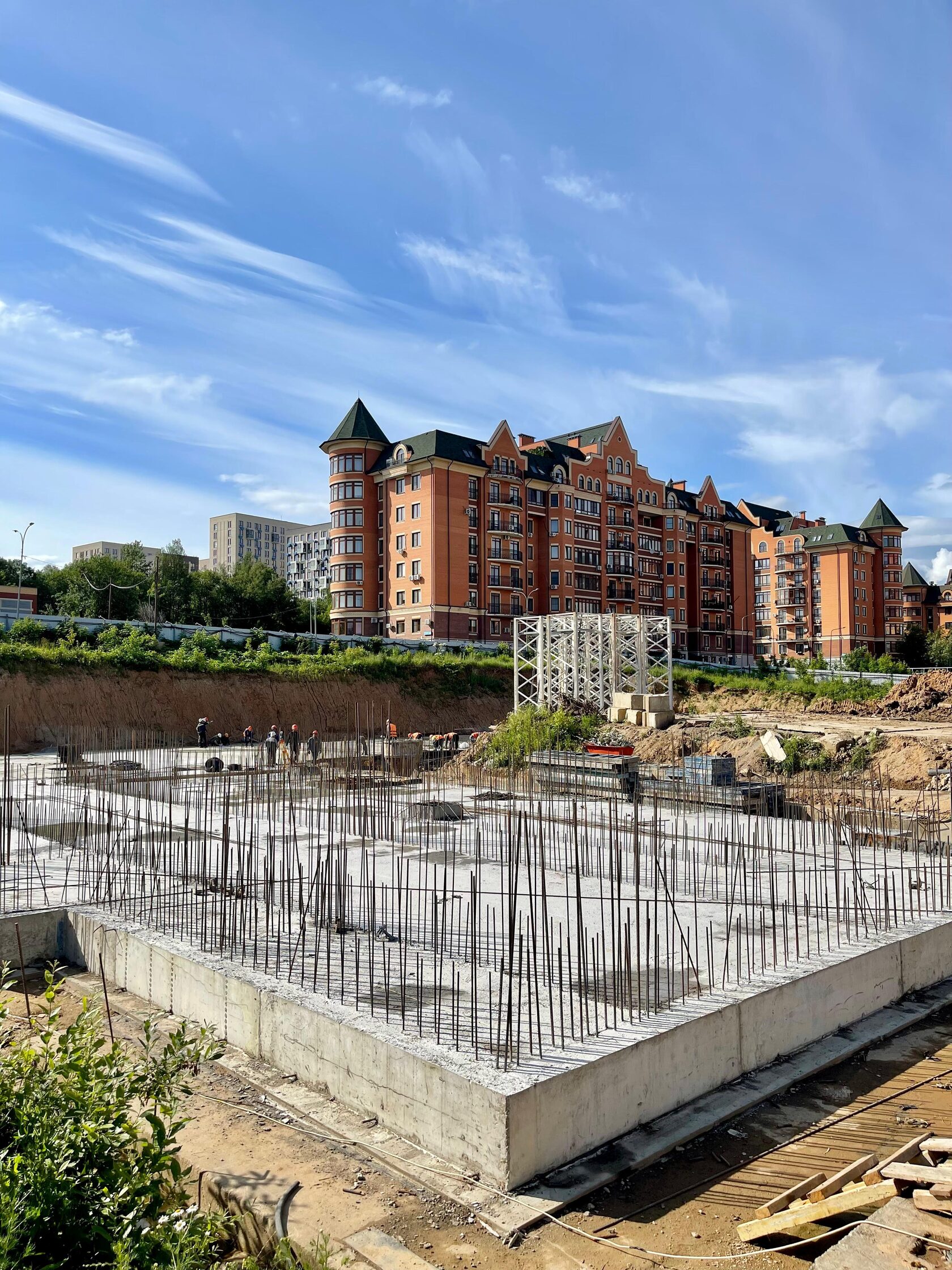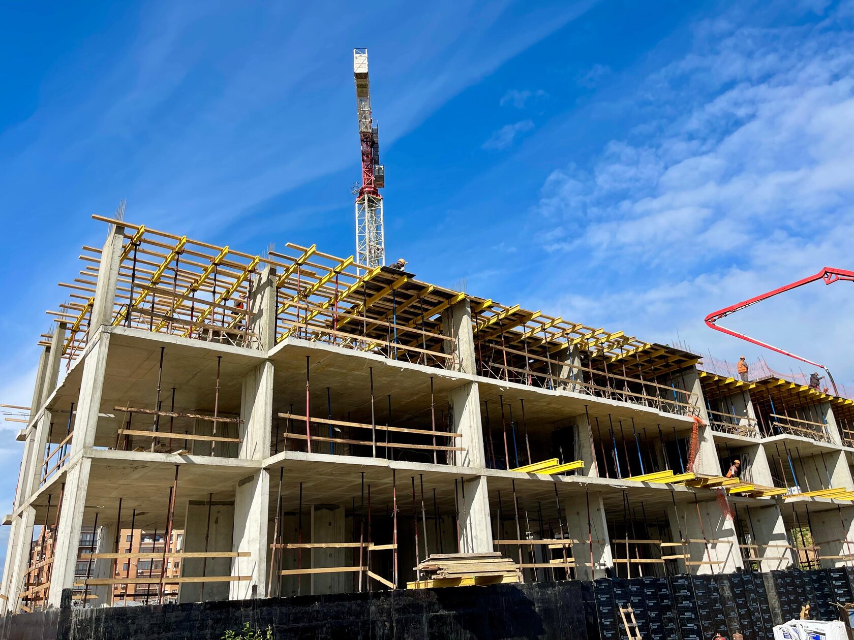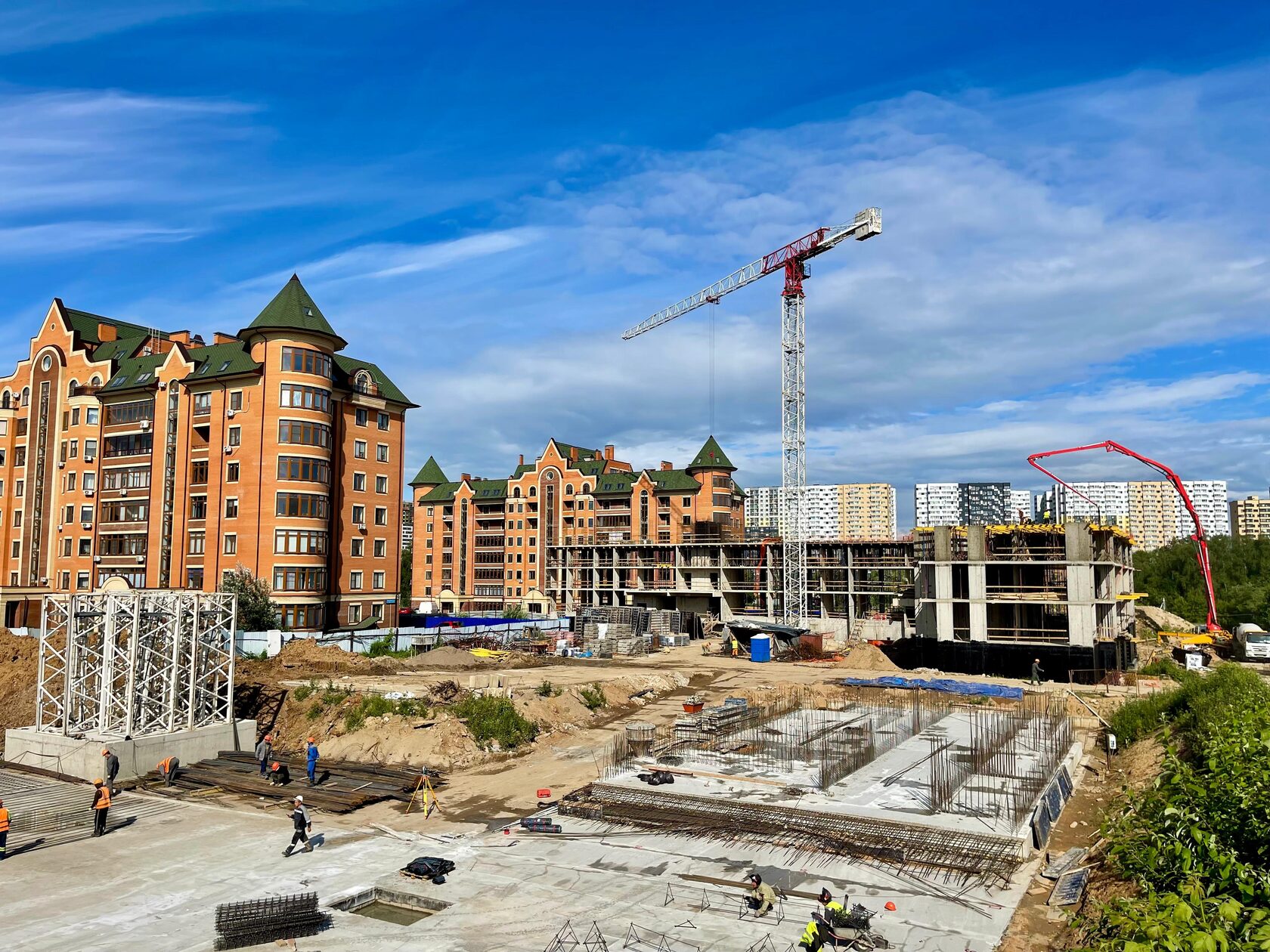 На строительной площадке ЖК «Берег» ведутся активные строительные работы. В корпусе №4 продолжаются фундаментные работы, в корпусе №8 осуществляется возведение монолитных конструкций и вязка арматуры на уровне 4-го этажа.