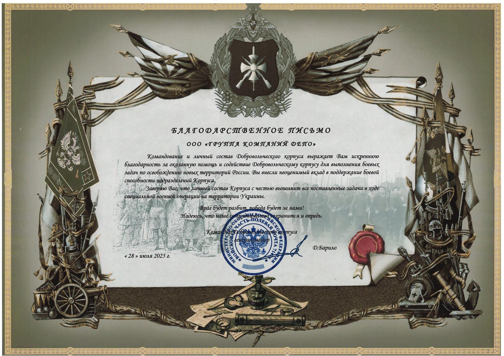 В июле 2025 года ГК «ДЕПО» получила Благодарственные письма от Фонда «Благородство и вера», 15-го отдельного отряда специального назначения «Вятич», Добровольческого корпуса и Фонда «СКИФ». Награды вручены за оказанную помощь, поддержку и активную гражданскую позицию компании. Это звено подтверждает социальную ответственность ГК «ДЕПО» и вклад в общественно значимые инициативы.